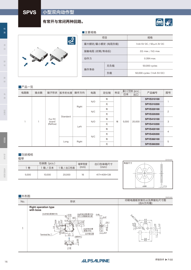 卧式 / 小型双向动作型 ・ 最大额定值:1mA 5V DC ・ 动作力:0.35N max. ・ 操作寿命(无负载):50000 cycles。