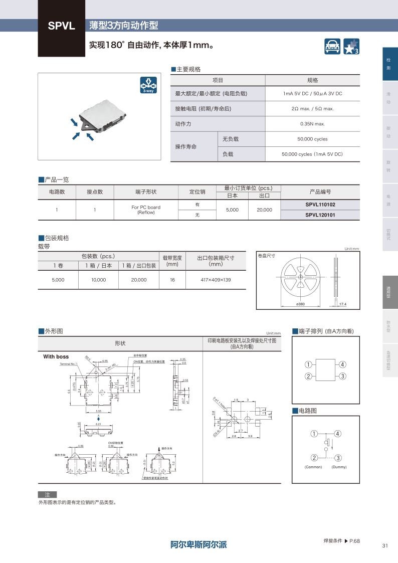 卧式 / 薄型多方向动作型 ・ 最大额定值:1mA 5V DC ・ 动作力:0.35N max. ・ 操作寿命(无负载):50000 cycles。