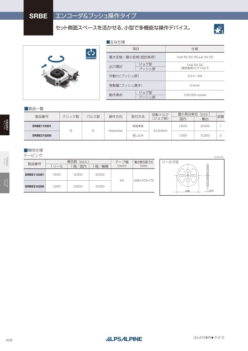 SRBE系列可以利用装备侧面空间的小型多功能装置。功能:中央按动和编码器 ・ 尺寸(W×D×H):8.05×11.0×2.35mm(表面贴装式) ・ 最大额定值:1mA 5V DC。