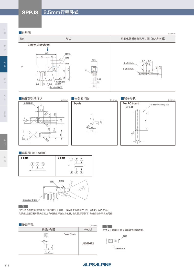 操纵杆高度4.7mm 小型卧式。操作方向:Horizontal ・ 最大额定值:0.2A 30V DC ・ 行程:2.5mm ・ 电路数:1/2-pole。