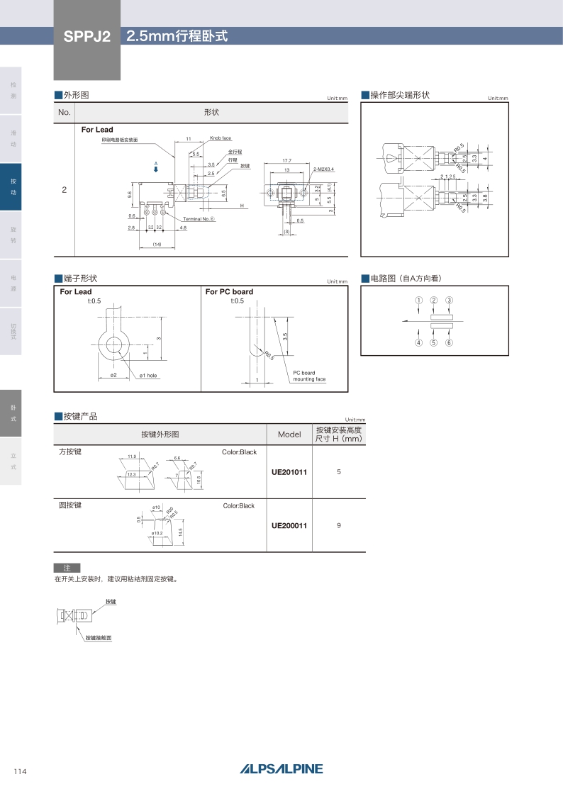 操纵杆高度5.5mm 可在操作板上直接安装。操作方向:Horizontal ・ 最大额定值:0.2A 30V DC ・ 行程:2.5mm ・ 电路数:2-pole。