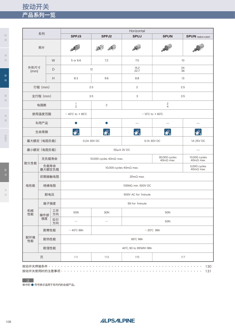 产品编号 照片 切换时限 行程 全行程 动作力 安装方法 电路数 动作 端子形状 尺寸(W×D×H)