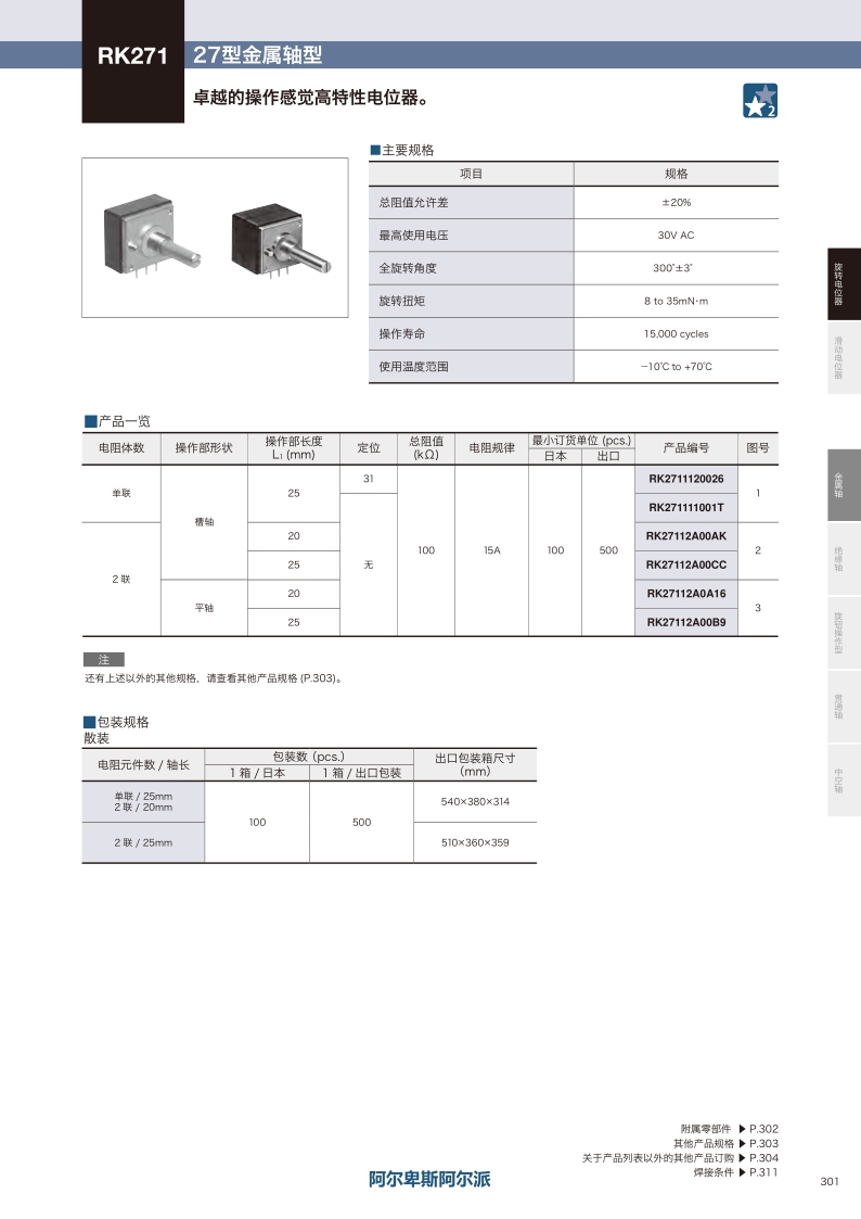 RK271系列卓越的操作感觉高特性电位器。型:金属轴 ・ 外形尺寸:27型 ・ 电阻体数:单联,2联 ・ 附属开关:无。