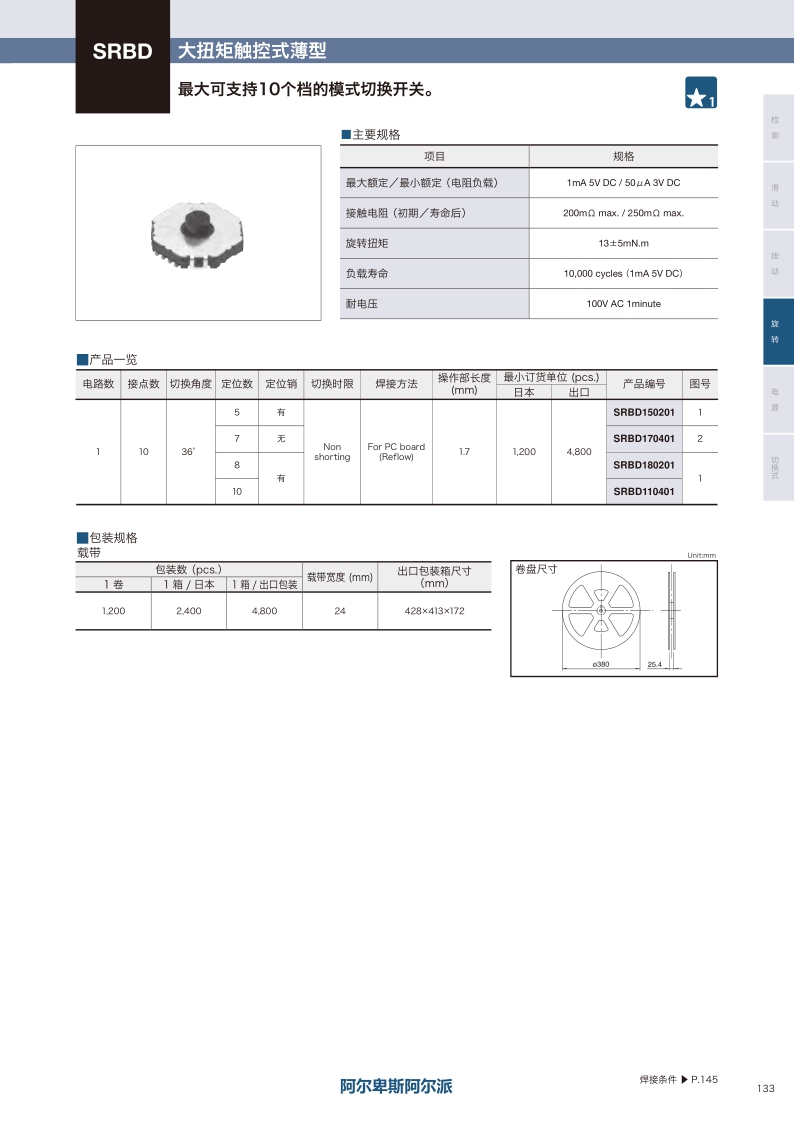 SRBD180201 照片 1 10 36° 8 Non shorting 13±5mN·m For PC borrd (Reflow) 1.7mm 10.0×10.0×1.7mm