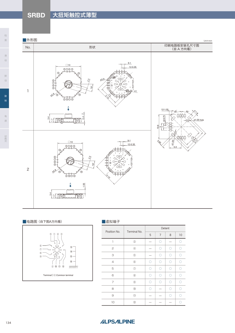 最大可支持10个档位的模式切换开关。位置数:10 ・ 操作方向:Vertical ・ 切换角度:36° ・ 电路数:1-pole ・ 最大额定值:1mA 5V DC。