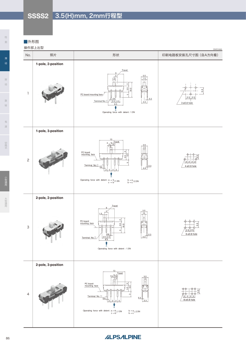 产品编号 照片 行程 操作部方向 操作部长度 电路数 接点数 动作力 切换时限 焊接方法 尺寸(W×D×H)