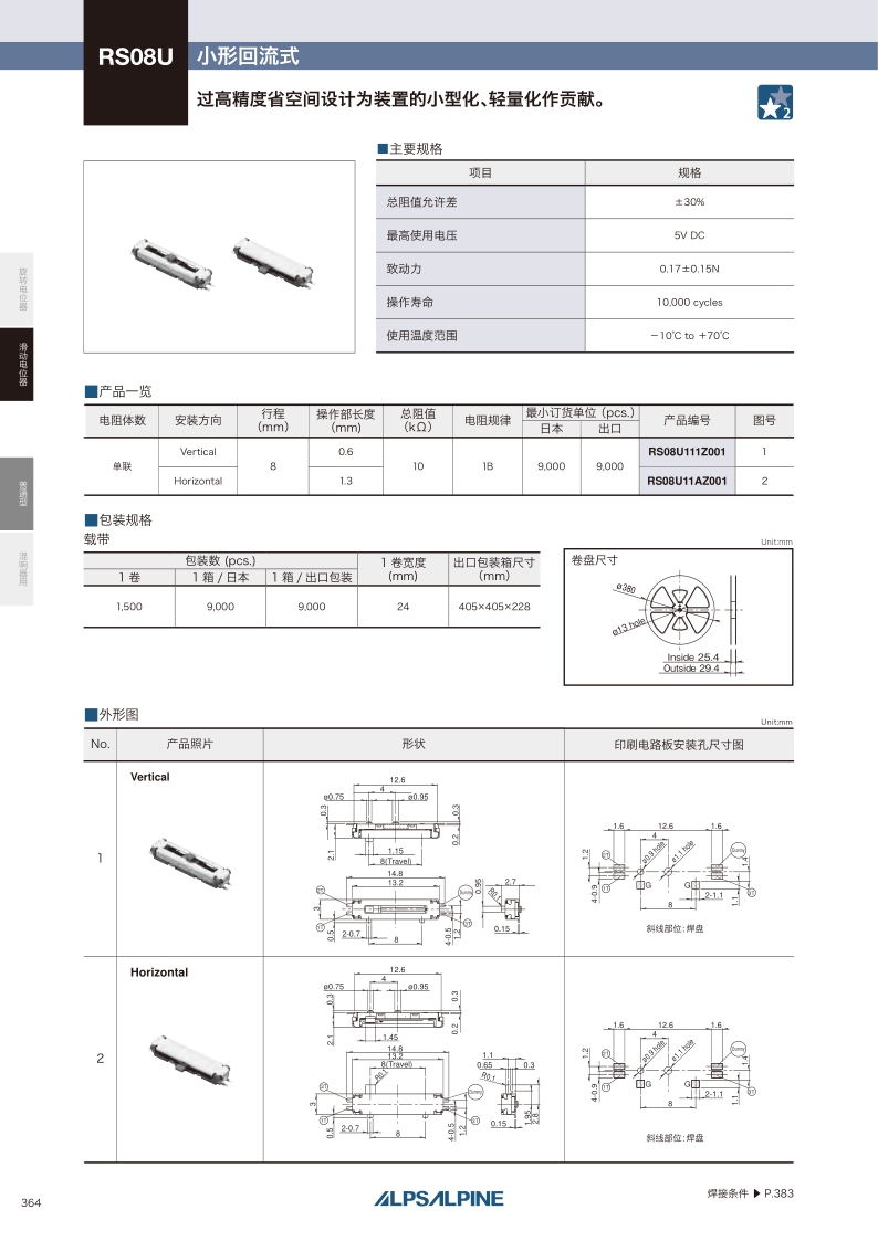 RS08U系列通过高精度省空间设计为装置的小型化、轻量化作贡献。小形回流 ・ 行程:8mm ・ 电阻体数:单联 ・ 操作方向:Vertical Horizontal。