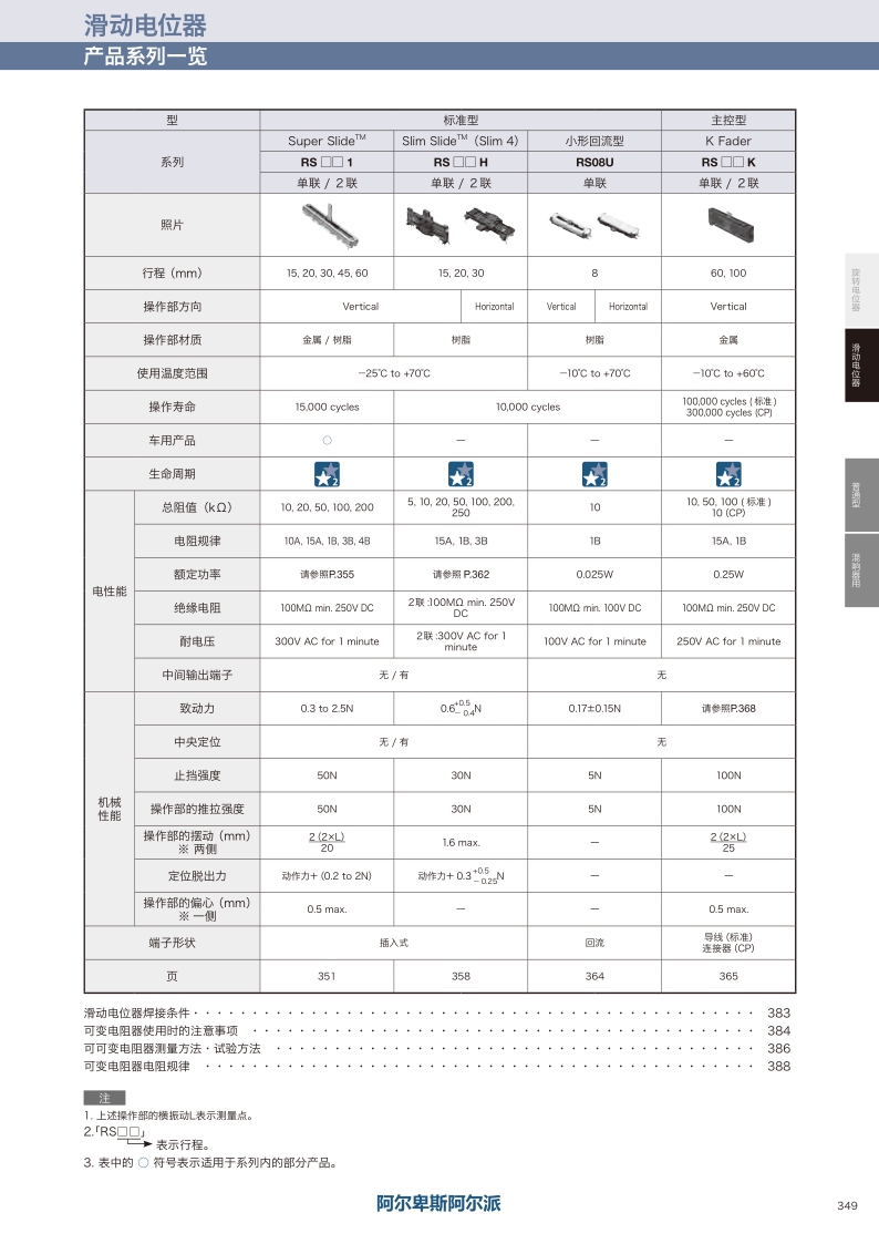 产品编号 照片 电阻体数 安装方向 行程 操作部长度 总阻值 电阻规律 定位