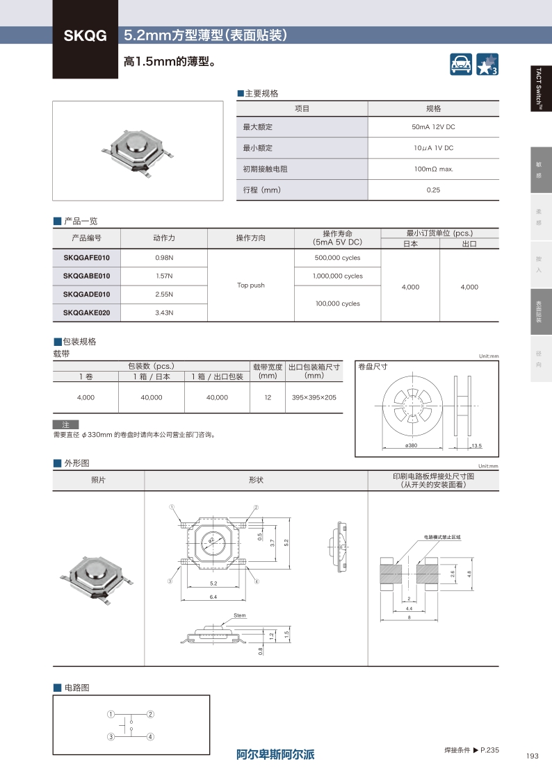 SKQGAFE010 照片 Surface mount 0.98N Top push 0.25mm 1.5mm 500,000 cycles 100mΩ max. 5.2 x 5.2×1.5