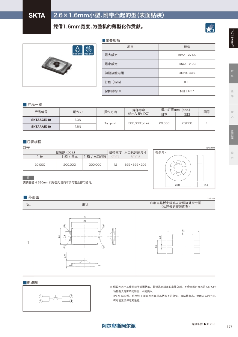 SKTAAAE010 照片 Surface mount 1.6N Top push 0.11mm 0.53mm 300,000 cycles 500mΩ max. IP67 2.6×1.6×0.53