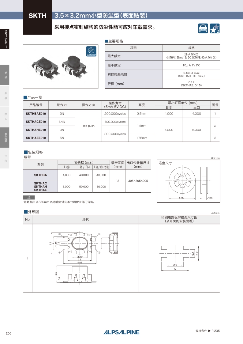 SKTHBAE010 照片 Surface mount 3.0N Top push 0.12mm 2.5mm 200,000 cycles 500mΩ max. IP6X 3.5×3.2×2.5