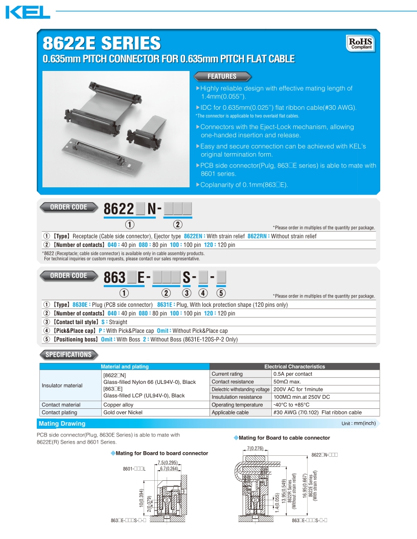 8622E 系列是用于 0.635mm 间距扁平电缆的连接器。采用单手装卸的锁定系统,提高工作效率。